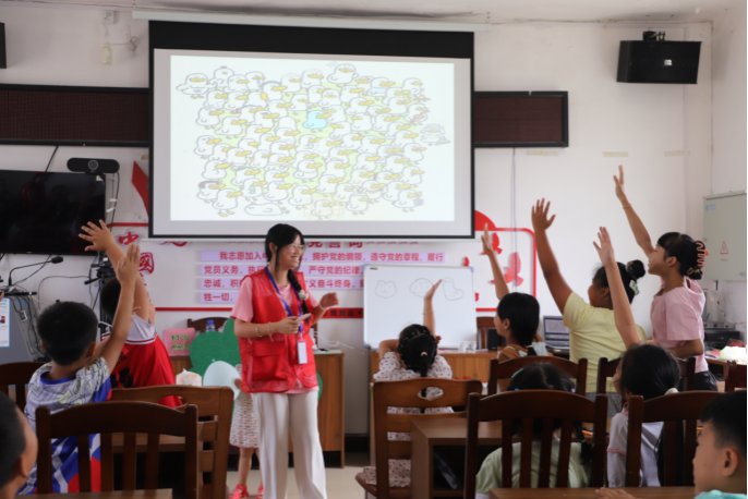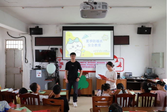 暑期溺水事故多发,实践队十分重视学生们的生命安全,开展了一堂防溺水安全教育课,关注假期游泳安全,提醒同学们玩水时必须有家长在旁边。驻村第一书记巫福星和驻村工作队员吴婕也在课上给学生们分发防溺水宣传单,强调暑期玩水安全,提醒学生“六不准、四牢记”。同时,实践队还关注当地学生的心理健康,据此设计了一节心理健康教育课,引导孩子用彩笔绘出心情、用故事表达自我,帮助他们学会接纳情绪、释放压力。