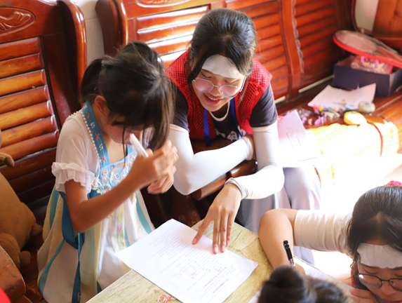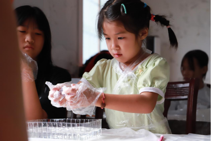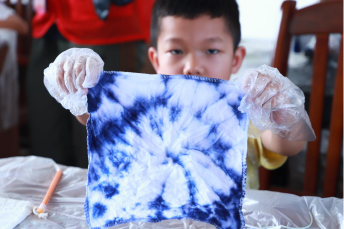 每位迎着清晨的阳光,天宝村及周围村落的25名学生陆续来到天宝村村委会议室参加夏令营活动。在非遗扎染体验手工课上,志愿者播放教学短片并进行现场示范后,为孩子们系上围兜、分发材料。折叠、扎结、浸染、拆线……当纯白的手帕与束口袋通过颜料晕染出独一无二的图案时,现场响起阵阵惊叹。石头绘画课上,实践队员支起小白板,让同学们在白板上设计要在石头上绘画的图案,再将鹅卵石、五颜六色的颜料、粗细不一的画笔等材料有序分发给同学。学生们专注地绘制着,以鹅卵石为画布,用画笔描绘自然与想象。