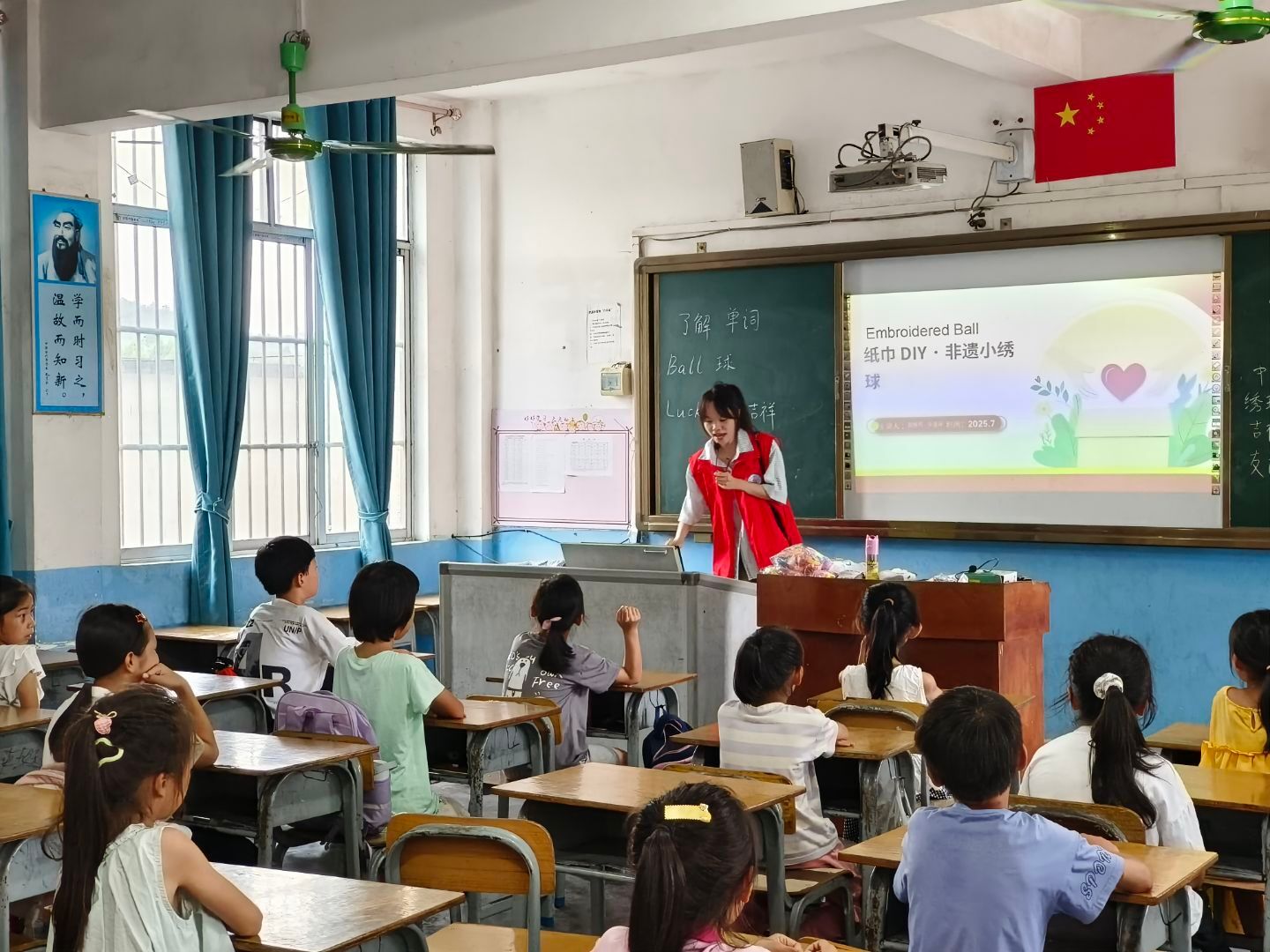 下午,非遗纸绣球课程开启。志愿者将非遗与英语结合,讲解绣球历史渊源和文化寓意,分发材料并示范制作技巧。在志愿者的耐心指导下,孩子们成功制作纸绣球,满是成就感。