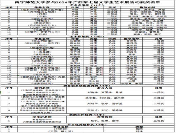 近日,广西第七届大学生艺术展演活动评奖结果公布,beats365官网 网页版报送40个作品喜获佳绩,荣获一等奖22项、二等奖13项、三等奖2项,校长风采奖1项,节目优秀创作奖2项。其中,艺术表演节目获一等奖4项、二等奖7项、三等奖1项;学生艺术作品获一等奖17项、二等奖3项;大学生艺术实践工作坊获二等奖1项;美育改革创新案例获一等奖1项、二等奖2项、三等奖1项,学校荣获优秀组织奖,是历届以来取得的最好成绩。